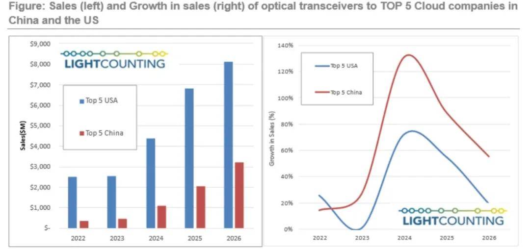 中国市场规模正在不断扩大,缩小与美国市场之间的差距。下图展示了中国和美国五大云计算公司光模块销售额的估计,并从绝对值(左)和增长率(右)两方面进行了比较。根据最新预测,中美之间的差距将从2022年的7倍缩小到2024年的4倍和2026年的2.5倍。