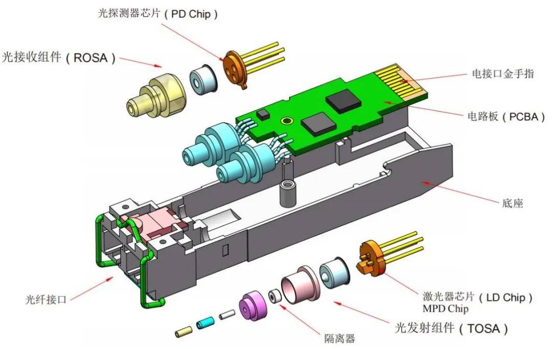 在功能实现层面,电→光转换由光发射组件TOSA完成,其集成激光二极管(LD)、背光监测二极管、耦合部件及温控模块(TEC)等元件——电信号经驱动芯片处理后驱动LD发射对应速率的调制光信号,再通过光功率自动控制电路动态调控输出功率,确保光信号稳定传输;而光→电转换则依托光接收组件ROSA,通过光电探测器(PD/APD)捕获光信号并转化为微弱电信号,经跨阻放大器与前置放大器(TIA)放大增益后,输出匹配速率的电信号。TOSA与ROSA协同构建光电转换闭环,支撑光传输网络信号交互,其性能演进更是光通信技术升级的核心驱动力。